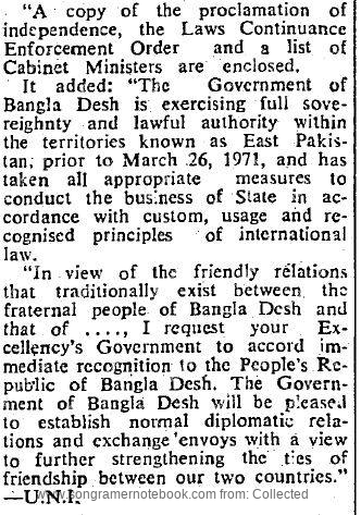 এক বিবৃতেতে ভারপ্রাপ্ত প্রেসিডেন্ট সৈয়দ নজরুল ইসলাম পৃথিবীর সকল রাষ্ট্রকে বাংলাদেশকে স্বীকৃতি দেয়ার আহবান জানিয়েছেন। এ ছাড়াও তিনি সকল দেশের রাষ্ট্রপ্রধানের কাছে পত্রও দিয়েছেন। পত্রে তিনি বিগত গণহত্যার বিবরন তুলে ধরেছেন। তিনি জানান সরকারের ঘোষণা মোতাবেক বিগত ২৬ তারিখ থেকেই বাংলাদেশ সরকার গঠিত হয়েছে এবং এ সরকারের প্রধান শেখ মুজিবুর রহমান। পত্রের সাথে তিনি এক কপি স্বাধীনতার ঘোষণা পত্র, আইন অব্যাহত আদেশ, তার সরকারের মন্ত্রীদের তালিকাও সংযুক্ত করে দিয়েছেন।