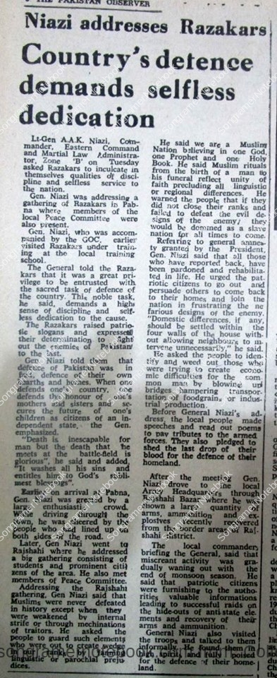 পাবনায় রাজাকারদের এক সমাবেশে লে. জেনারেল নিয়াজী রাজাকারদের সুশৃঙ্খলভাবে দেশ ও জাতির সেবায় আত্মনিয়োগ করার আহবান জানান। সমাবেশে জেলার শান্তিকমিটির সদস্যরাও উপস্থিত ছিলো। সমাবেশের আগে নিয়াজি স্থানীয় জি ও সি কে নিয়ে স্থানীয় রাজাকার ট্রেনিং সেন্টারে প্রশিক্ষণরত রাজাকারদের প্রশিক্ষন দেখেন। নিয়াজি রাজাকারদের বলেন দেশের প্রতিরক্ষার পবিত্র দায়িত্ব পালন করা একটি মহত্তম কাজ। এ মহান কাজের জন্য প্রয়োজন উচুমানের শৃঙ্খলা বোধ ও নিঃস্বার্থ ত্যাগ। রাজাকার রা এসময় মুহুর্মুহু স্লোগান দিতে থাকে। এবং পাকিস্তানের শত্রুদের সাথে শেষ মুহূর্ত পর্যন্ত লড়াই করার সংকল্প প্রকাশ করে।